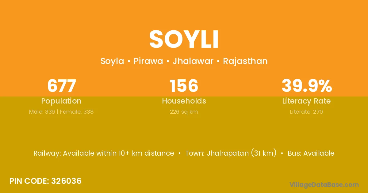 Jhalrapatan (31 km) is the nearest town to Soyli village for major economic activities and is located approximately 31 km away.