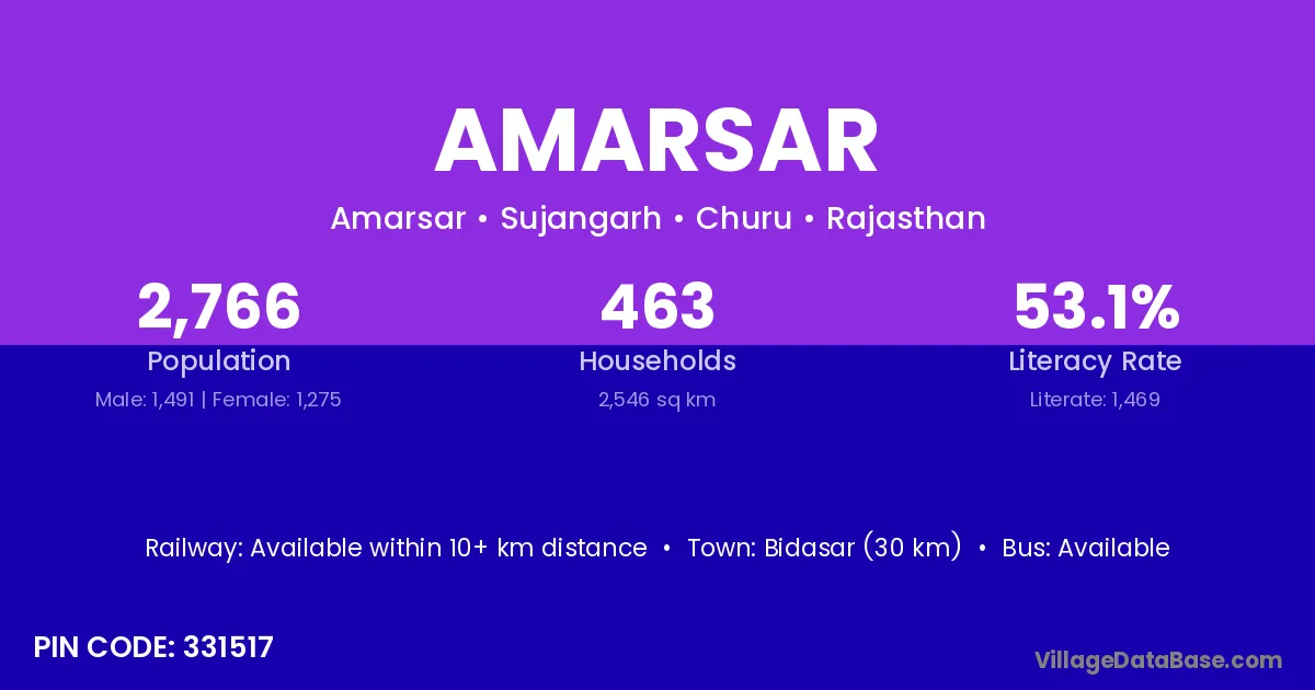 Surajgarh (15 km) is the nearest town to Amarsar village for major economic activities and is located approximately 15 km away.