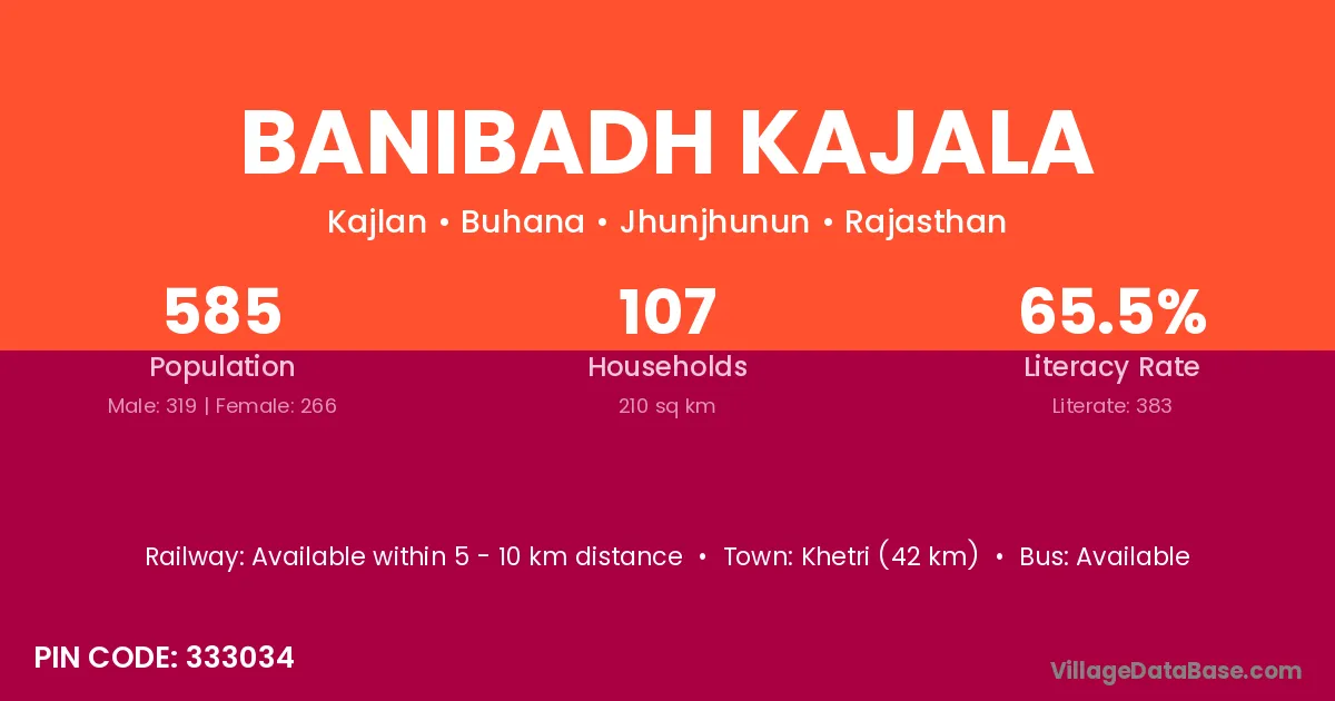 Khetri (42 km) is the nearest town to Banibadh Kajala village for major economic activities and is located approximately 42 km away.