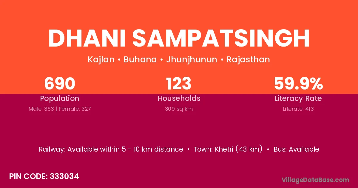 Khetri (43 km) is the nearest town to Dhani Sampatsingh village for major economic activities and is located approximately 43 km away.