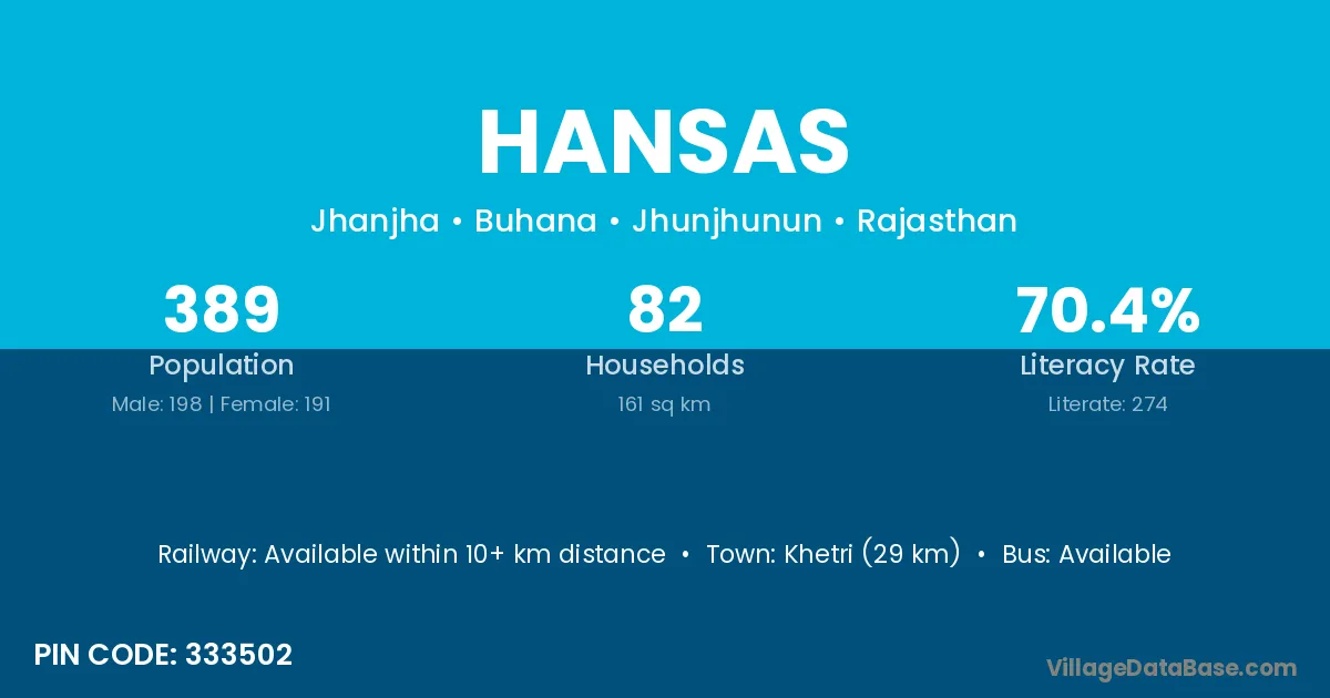 Khetri (29 km) is the nearest town to Hansas village for major economic activities and is located approximately 29 km away.