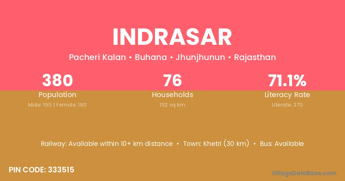 Khetri (30 km) is the nearest town to Indrasar village for major economic activities and is located approximately 30 km away.