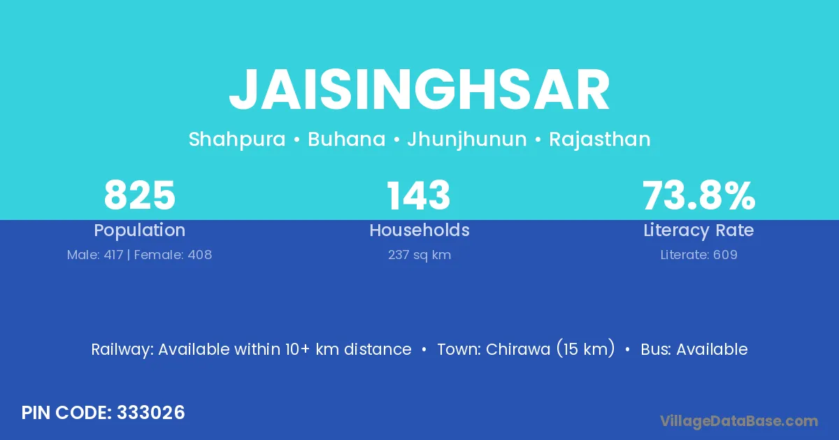 Jaisinghsar village has a total population of 825 people, of which 417 are males and 408 are females.
