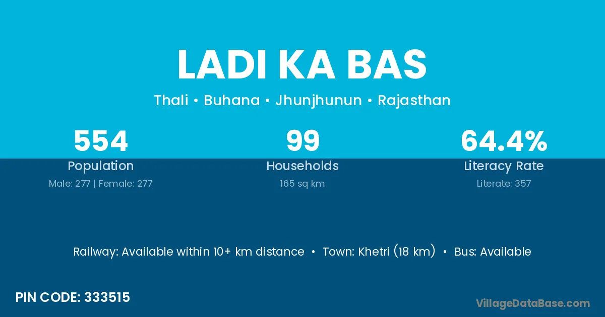 Khetri (18 km) is the nearest town to Ladi Ka Bas village for major economic activities and is located approximately 18 km away.