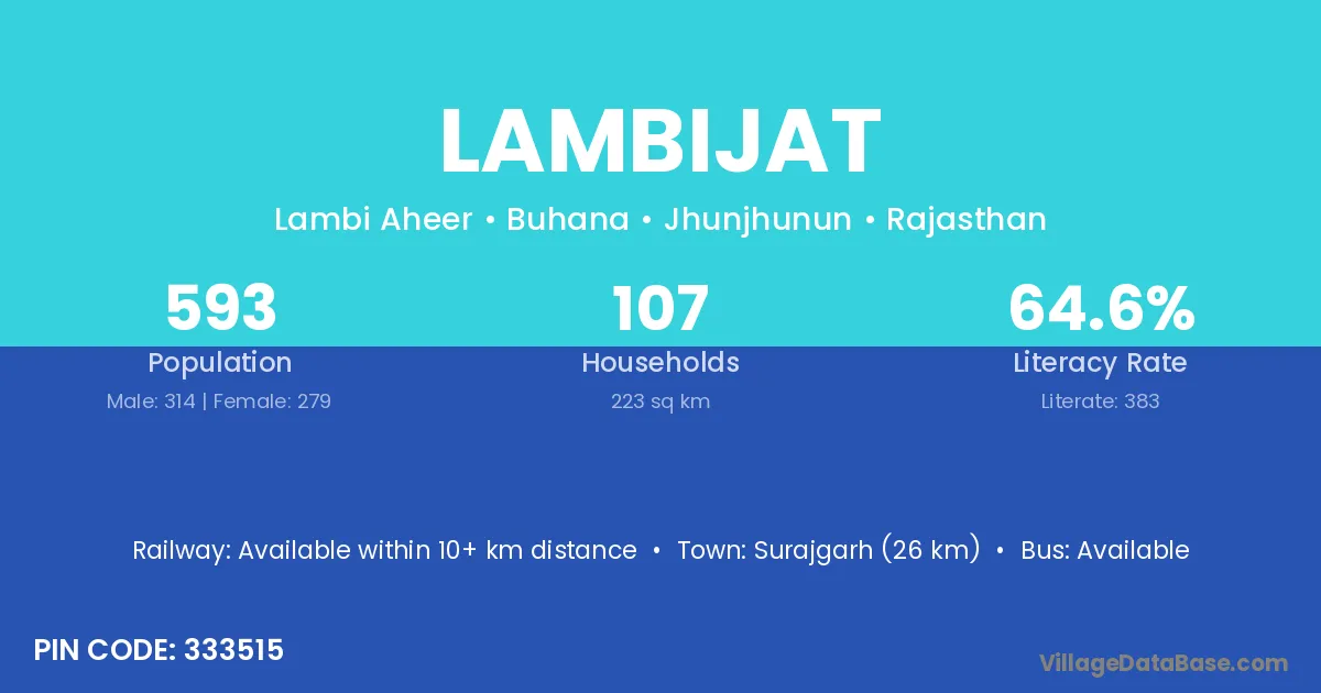 Lambijat village has a total population of 593 people, of which 314 are males and 279 are females.