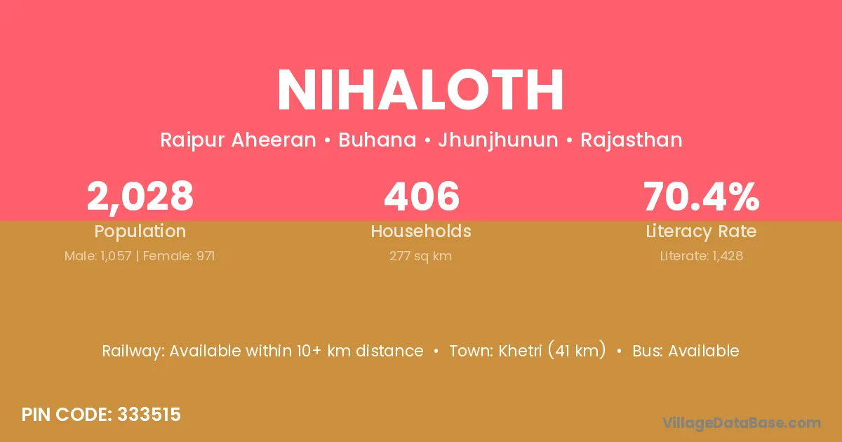 Khetri (41 km) is the nearest town to Nihaloth village for major economic activities and is located approximately 41 km away.