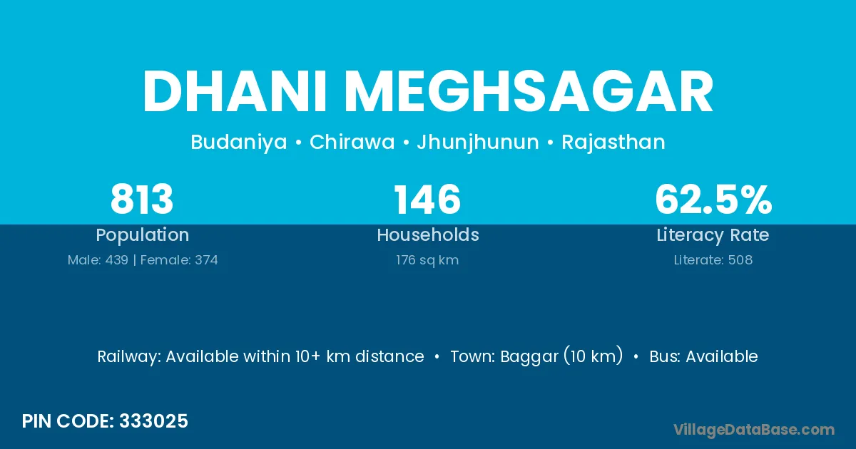 Baggar (10 km) is the nearest town to Dhani Meghsagar village for major economic activities and is located approximately 10 km away.