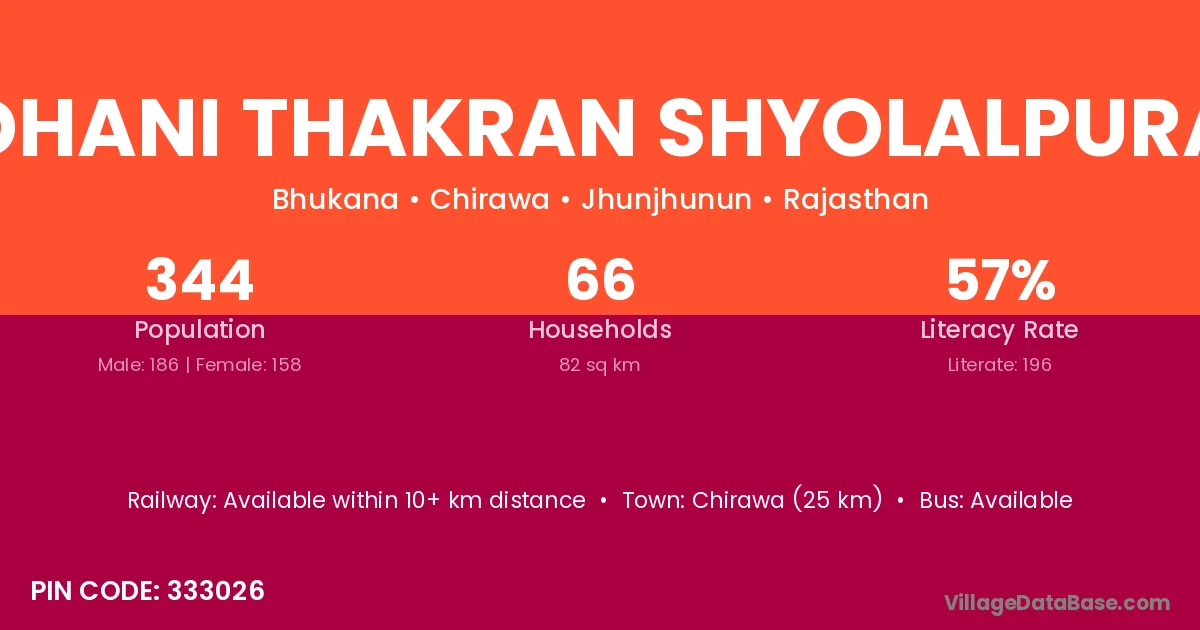 Chirawa (25 km) is the nearest town to Dhani Thakran Shyolalpura village for major economic activities and is located approximately 25 km away.