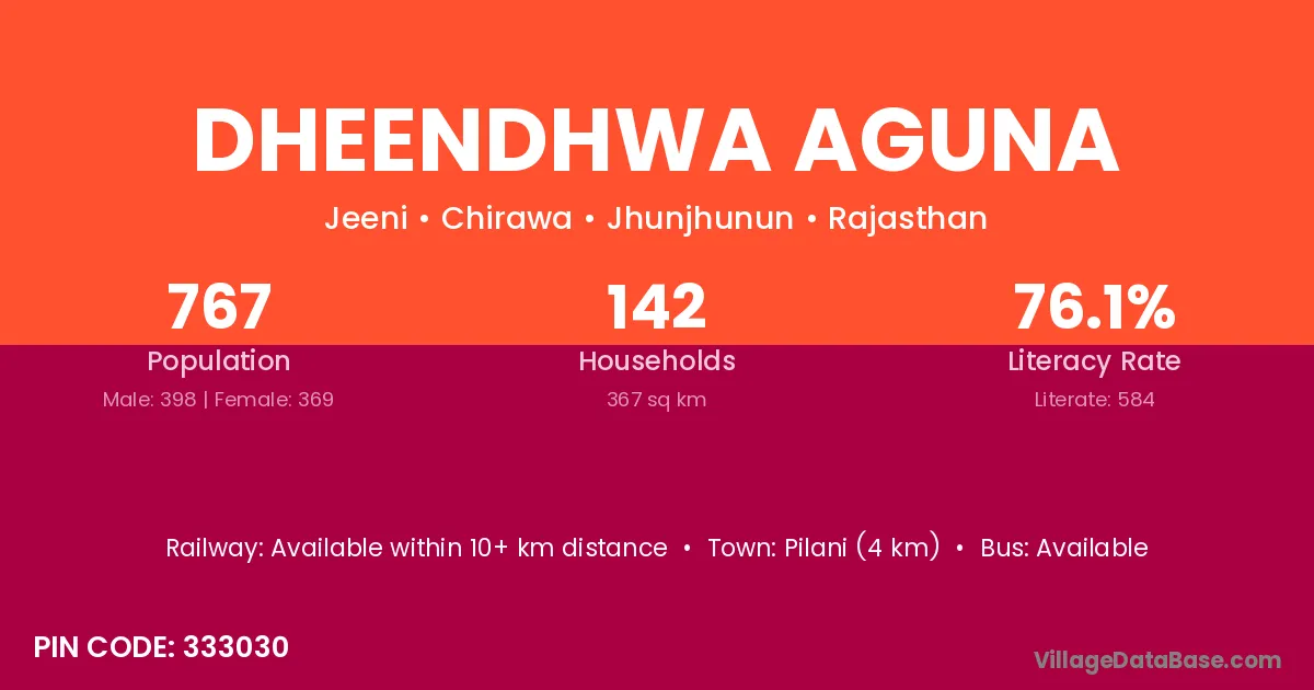 Pilani (4 km) is the nearest town to Dheendhwa Aguna village for major economic activities and is located approximately 4 km away.