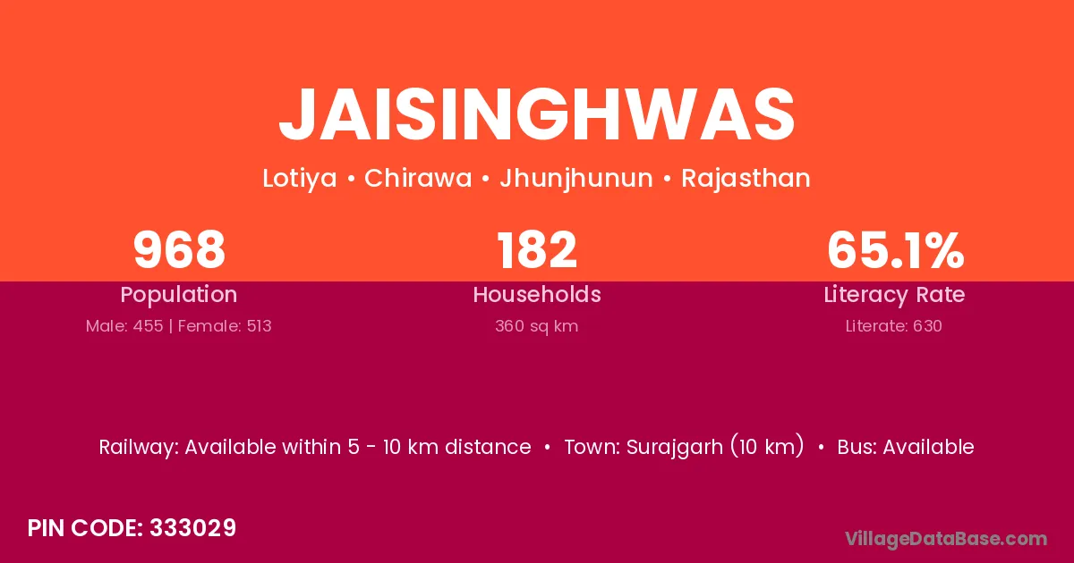 Jaisinghwas village has a total population of 968 people, of which 455 are males and 513 are females.