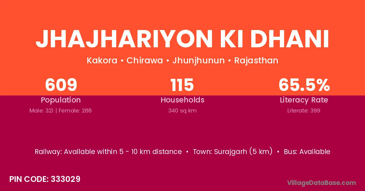 Jhajhariyon Ki Dhani village has a total population of 609 people, of which 321 are males and 288 are females.