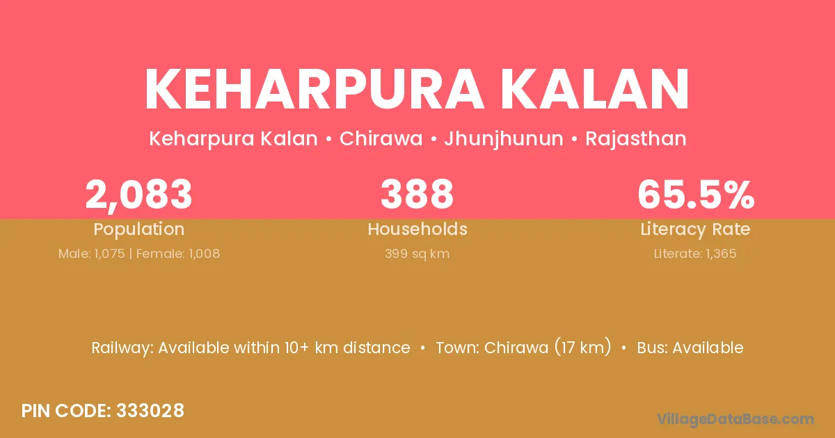 Chirawa (17 km) is the nearest town to Keharpura Kalan village for major economic activities and is located approximately 17 km away.