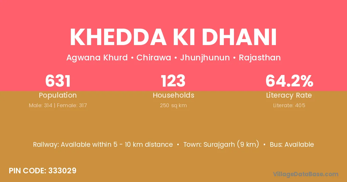 Khedda Ki Dhani village has a total population of 631 people, of which 314 are males and 317 are females.