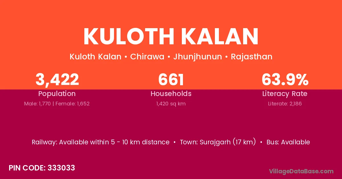 Surajgarh (17 km) is the nearest town to Kuloth Kalan village for major economic activities and is located approximately 17 km away.