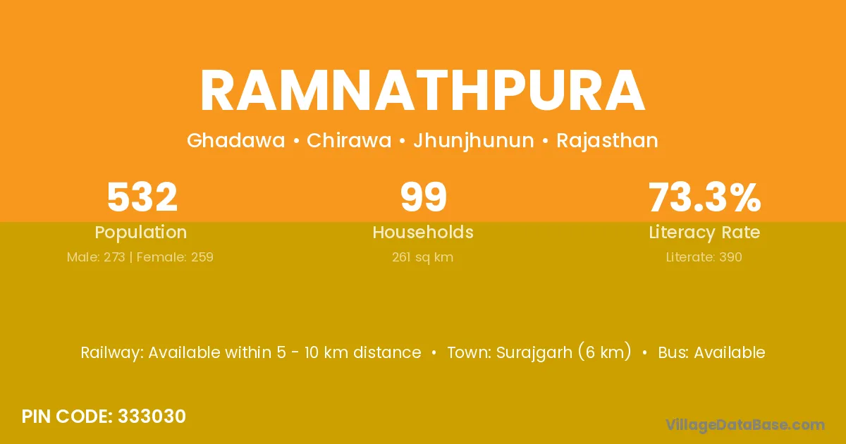 Surajgarh (6 km) is the nearest town to Ramnathpura village for major economic activities and is located approximately 6 km away.