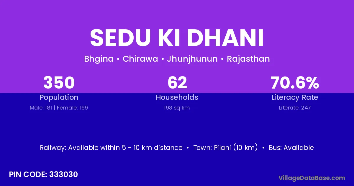 Pilani (10 km) is the nearest town to Sedu Ki Dhani village for major economic activities and is located approximately 10 km away.