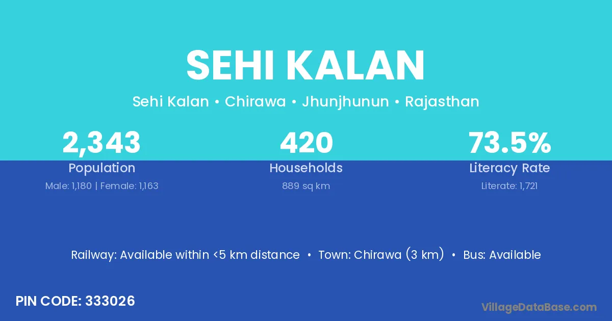 Chirawa (3 km) is the nearest town to Sehi Kalan village for major economic activities and is located approximately 3 km away.