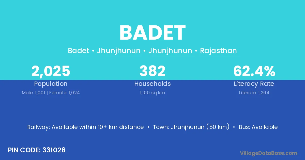 Jhunjhunun (50 km) is the nearest town to Badet village for major economic activities and is located approximately 50 km away.