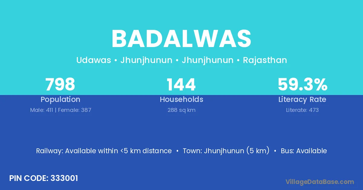 Khetri (22 km) is the nearest town to Badalwas village for major economic activities and is located approximately 22 km away.