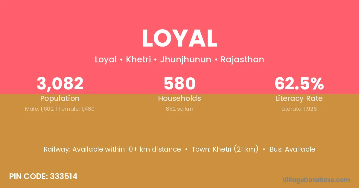 Khetri (21 km) is the nearest town to Loyal village for major economic activities and is located approximately 21 km away.