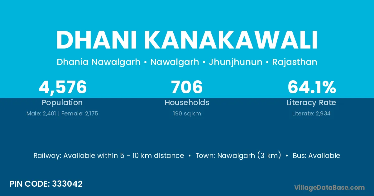 Nawalgarh (3 km) is the nearest town to Dhani Kanakawali village for major economic activities and is located approximately 3 km away.