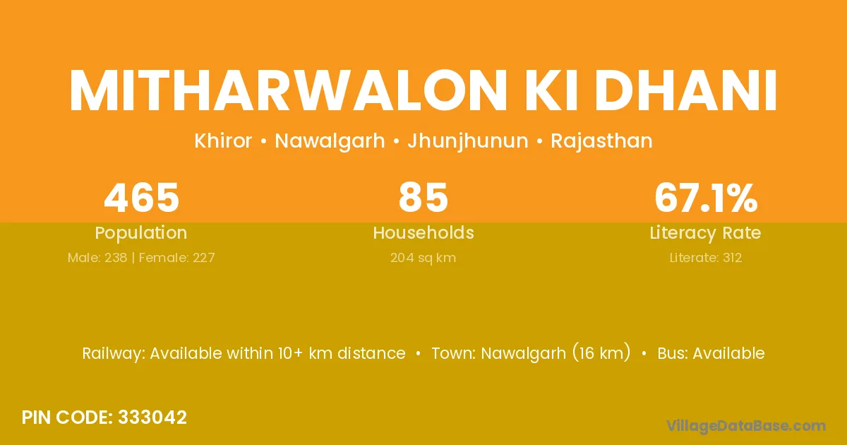 Mitharwalon Ki Dhani village has a total population of 465 people, of which 238 are males and 227 are females.