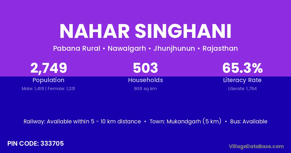 Mukandgarh (5 km) is the nearest town to Nahar Singhani village for major economic activities and is located approximately 5 km away.