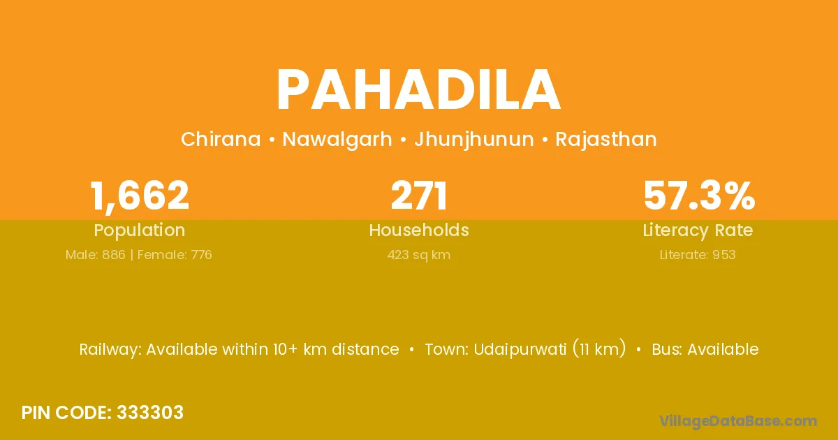 Udaipurwati (11 km) is the nearest town to Pahadila village for major economic activities and is located approximately 11 km away.