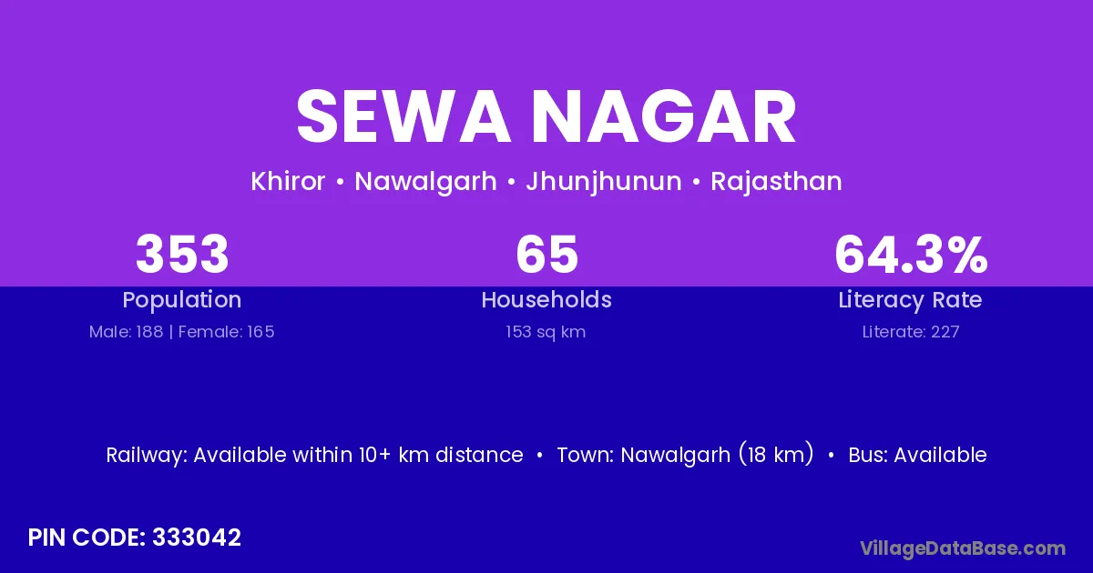 Nawalgarh (18 km) is the nearest town to Sewa Nagar village for major economic activities and is located approximately 18 km away.
