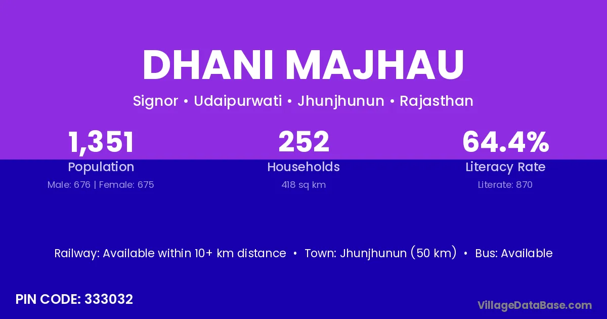 Dhani Majhau village has a total population of 1,351 people, of which 676 are males and 675 are females.