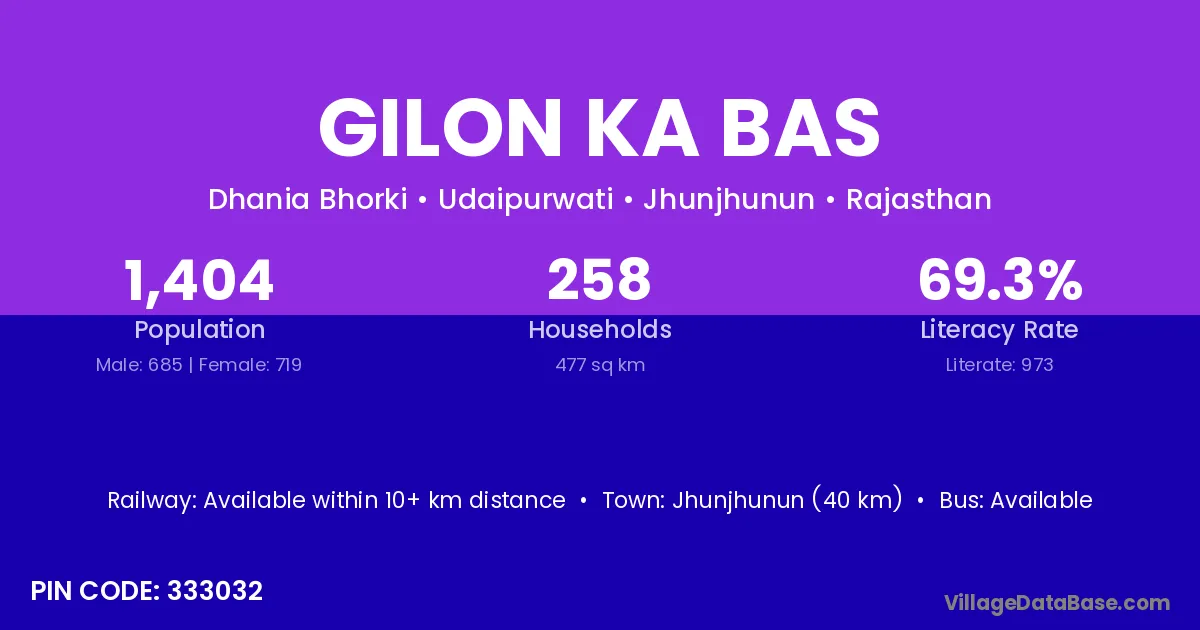 Jhunjhunun (40 km) is the nearest town to Gilon Ka Bas village for major economic activities and is located approximately 40 km away.