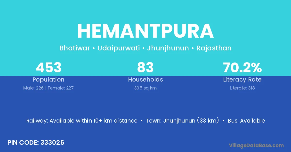 Jhunjhunun (33 km) is the nearest town to Hemantpura village for major economic activities and is located approximately 33 km away.