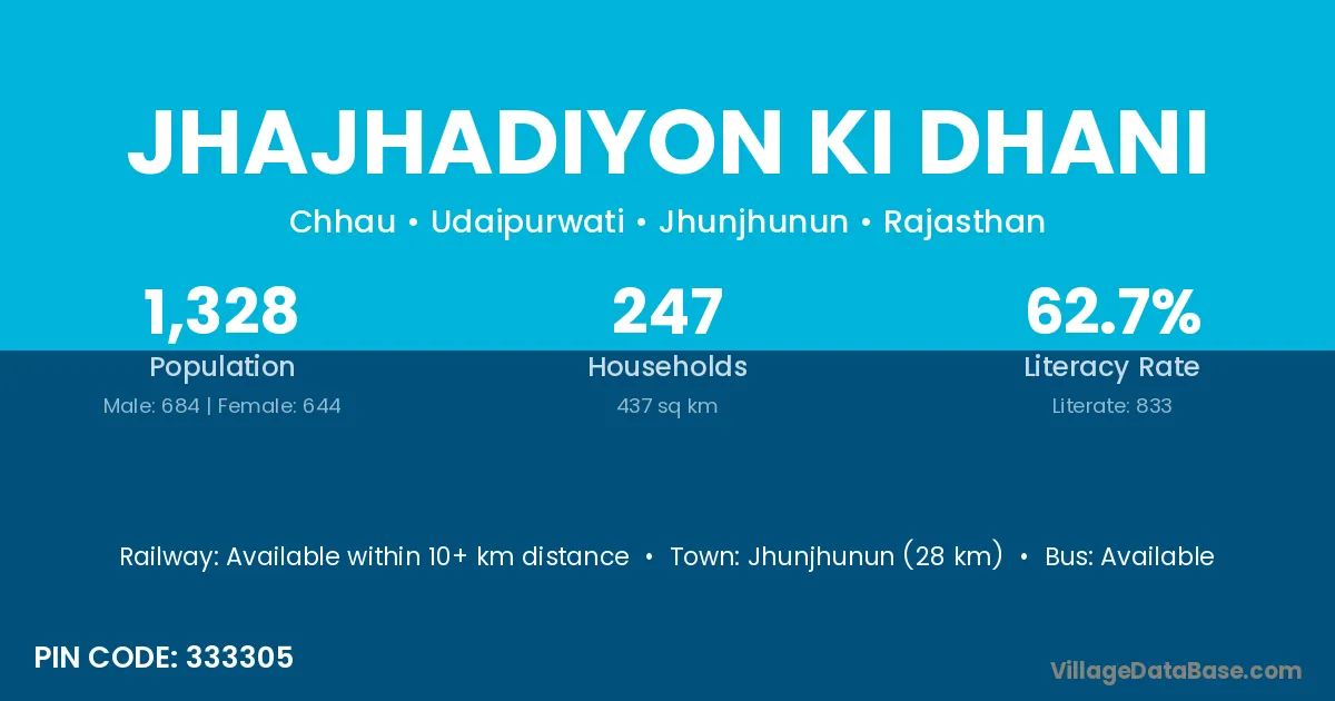 Jhajhadiyon Ki Dhani village has a total population of 1,328 people, of which 684 are males and 644 are females.