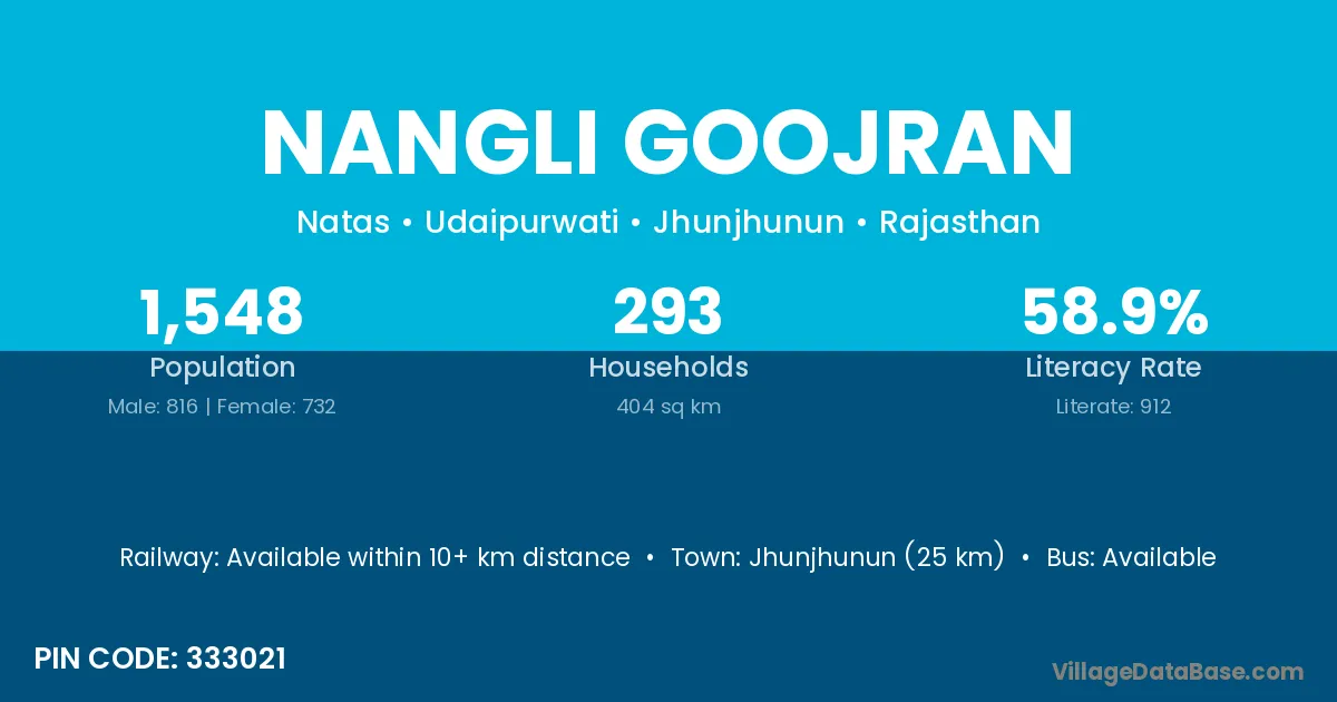 Jhunjhunun (25 km) is the nearest town to Nangli Goojran village for major economic activities and is located approximately 25 km away.