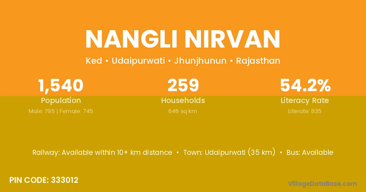 Udaipurwati (35 km) is the nearest town to Nangli Nirvan village for major economic activities and is located approximately 35 km away.