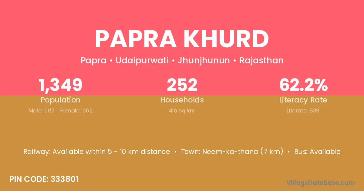 Papra Khurd village has a total population of 1,349 people, of which 687 are males and 662 are females.