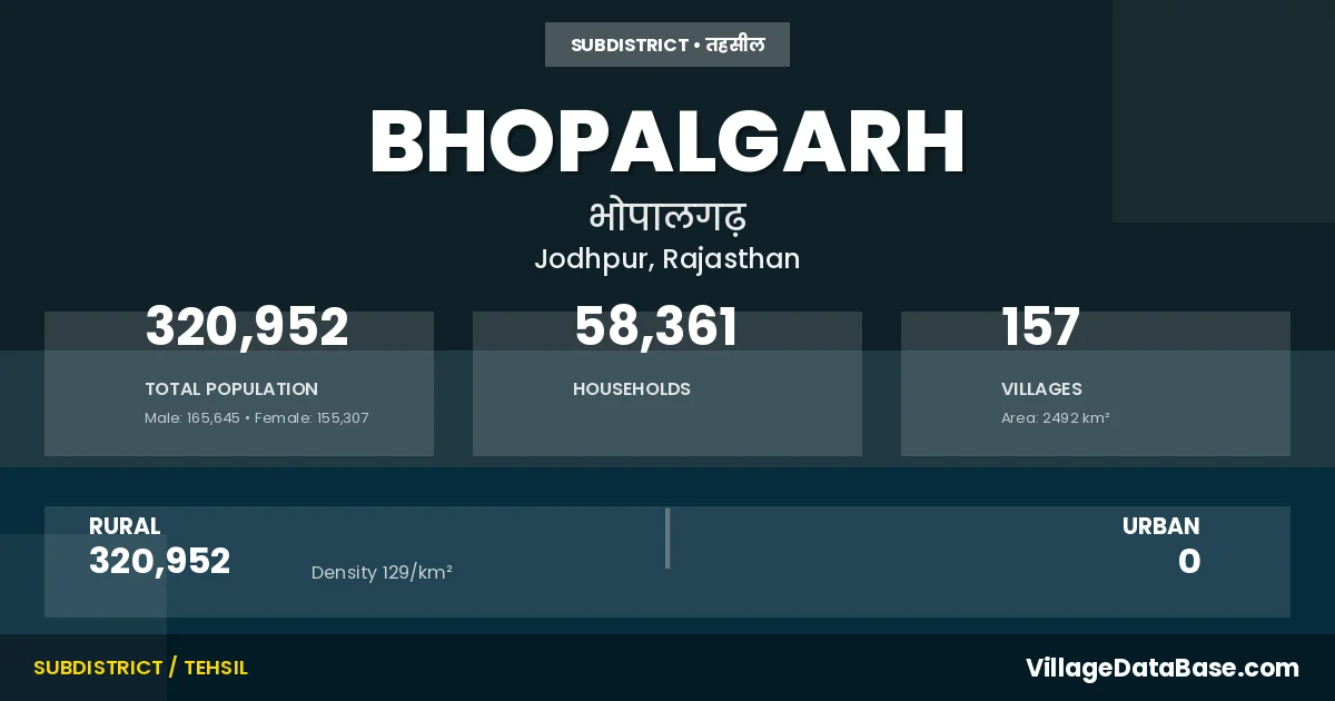 According to the 2011 census The total area of Bhopalgarh Tehsil is 2492 km², with a population of 320952 people. The population density is 129 inhabitants per square kilometre, and there are approximately 58361 houses in the sub district.