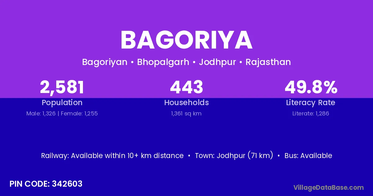 Jodhpur (71 km) is the nearest town to Bagoriya village for major economic activities and is located approximately 71 km away.