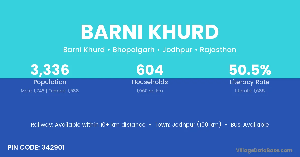 Jodhpur (100 km) is the nearest town to Barni Khurd village for major economic activities and is located approximately 100 km away.