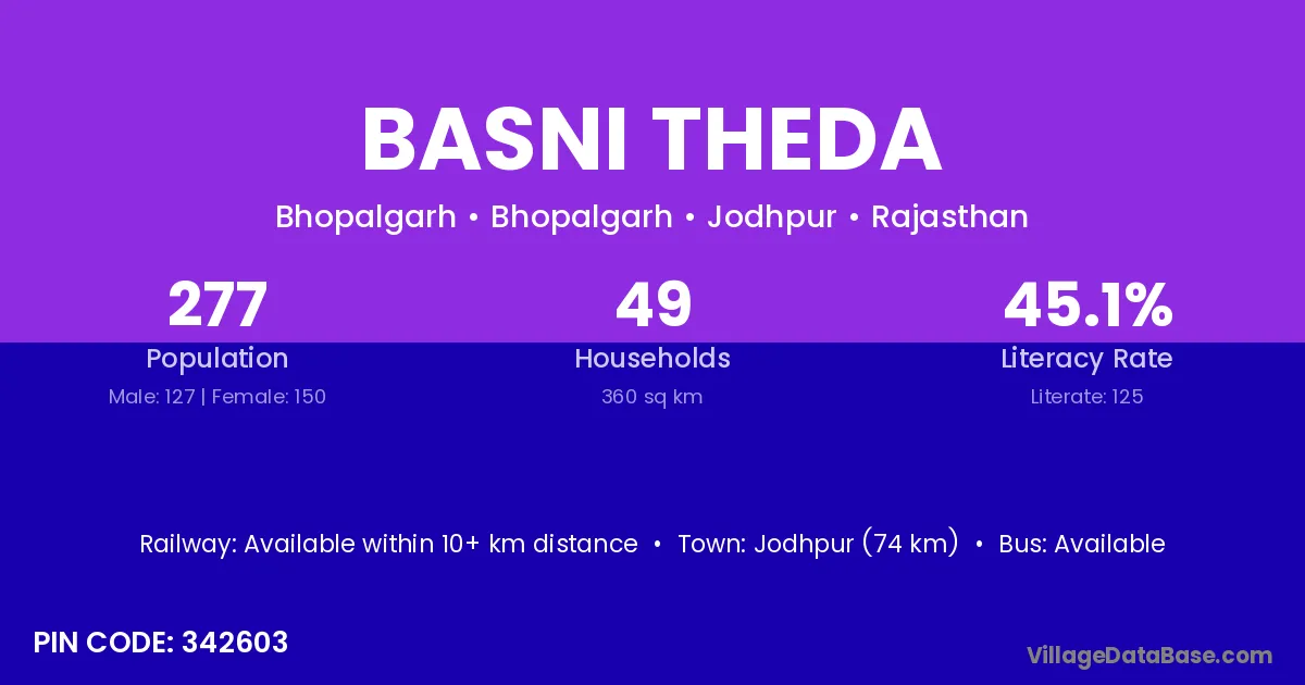 Jodhpur (74 km) is the nearest town to Basni Theda village for major economic activities and is located approximately 74 km away.