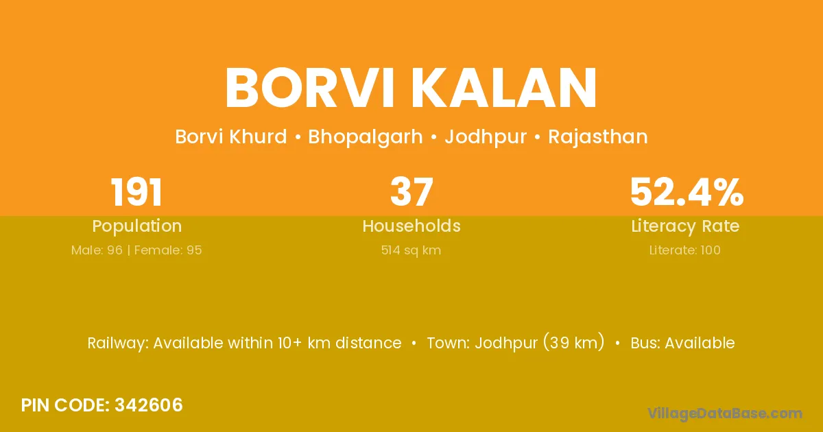 Jodhpur (39 km) is the nearest town to Borvi Kalan village for major economic activities and is located approximately 39 km away.