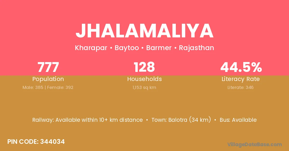Pipar City (25 km) is the nearest town to Jhalamaliya village for major economic activities and is located approximately 25 km away.
