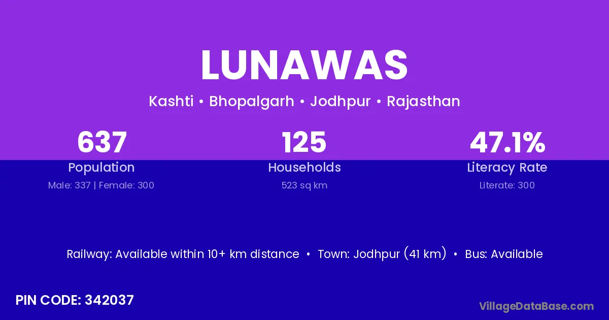 Jodhpur (41 km) is the nearest town to Lunawas village for major economic activities and is located approximately 41 km away.