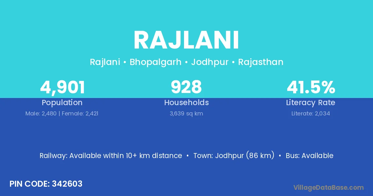Jodhpur (86 km) is the nearest town to Rajlani village for major economic activities and is located approximately 86 km away.