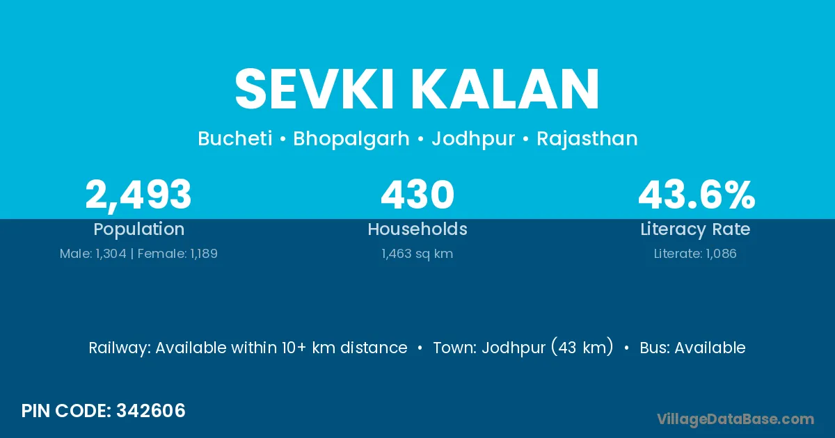 Jodhpur (43 km) is the nearest town to Sevki Kalan village for major economic activities and is located approximately 43 km away.