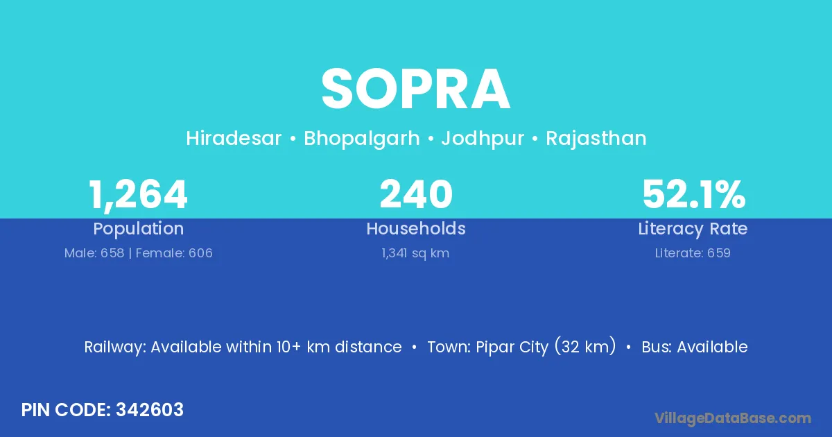 Sopra village has a total population of 1,264 people, of which 658 are males and 606 are females.