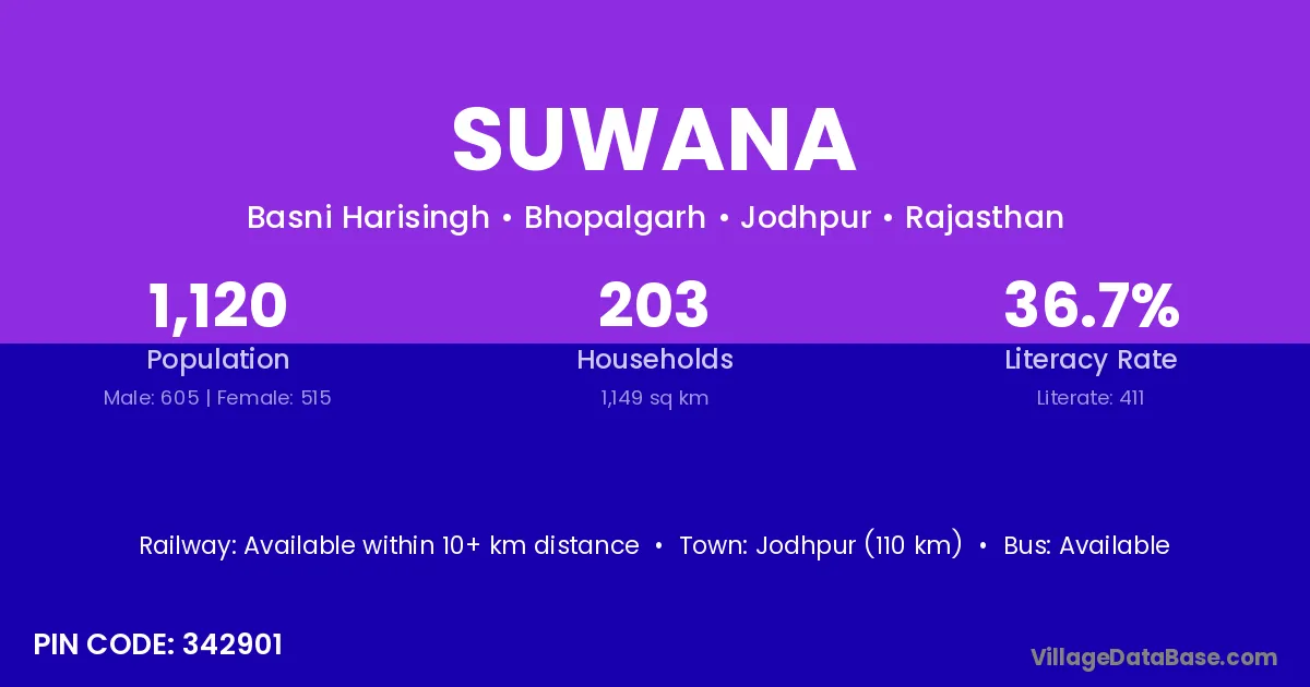 Jodhpur (110 km) is the nearest town to Suwana village for major economic activities and is located approximately 110 km away.
