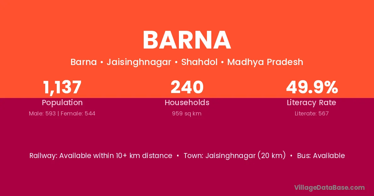 The literacy rate of Barna village is 50.75%. Male literacy stands at 66.50% and female literacy at 35.76%.