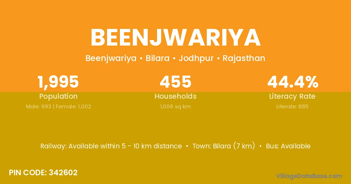 Bilara (7 km) is the nearest town to Beenjwariya village for major economic activities and is located approximately 7 km away.