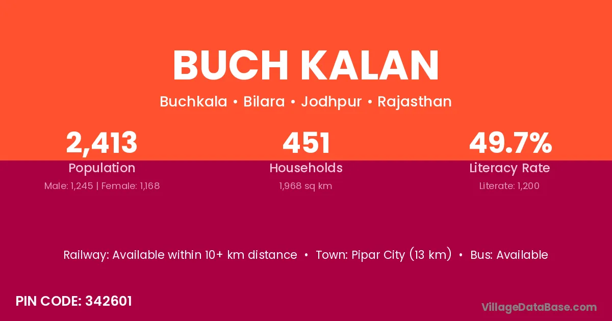 Pipar City (13 km) is the nearest town to Buch Kalan village for major economic activities and is located approximately 13 km away.